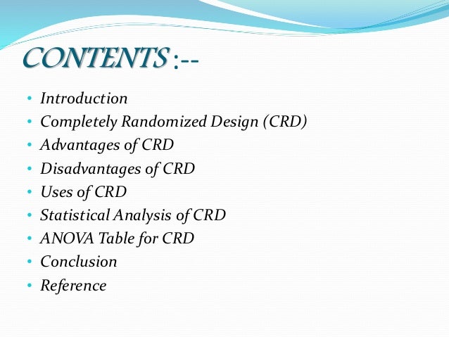 In academic discourse, while CRD is praised for its rigor and clarity, the effectiveness of the design relies heavily on the meticulous selection of the independent variable. Making this choice with thorough consideration ensures the research offers valuable insights with both academic and wider societal implications. For fixed, random, and mixed models (balanced), the ANOVA table sums of squares calculations are identical. The only difference is with the expected mean squares, thus the test statistics. (e.g., contrasts) is analogous to the balanced case, with modifications in the formulas for means and standard errors to account for unequal sample sizes. Orthogonal contrasts can be used to further partition the model sum of squares.